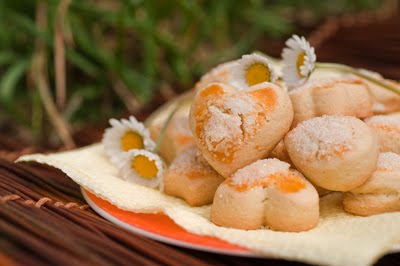 Така готовото тесто се разстила и се раздочва до дебелина 1 см. и се изрязва с подходящи формички. Оформените курабии се нареждат в намаслена тава, намазват се с жълтък и се поръсват със захарта на кристали. Пекат се в предварително загрята на 200 градуса фурна.