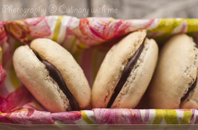 Приготвянето на крема е съвсем лесно. Натрошете на дребно шоколада и го разтопете на водна баня. Добавете ванилията и охладете, като бъркате интензивно. Шоколадът е лъскав, гладък и аромантен. Към тази смес, добавете сметаната и отново бъркайте. Охладете за половин час, напълнете пош и шприцовайте върху половината от черупките за макарони. С останалата половина черупки слепете и завършете макароните.