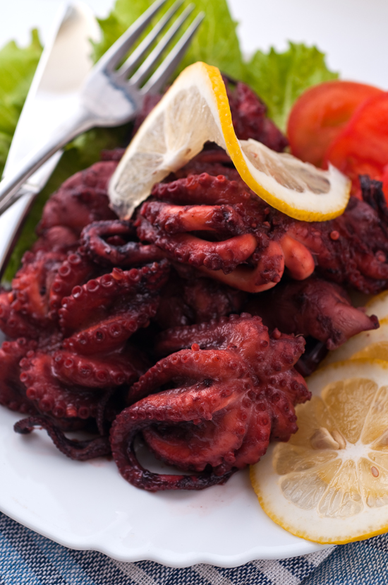 Накиснете октоподите за няколко часа в бялото вино, лимоновия сок, бахара, черния пипер, дафиновите листа и резените лимон. Октоподите, заедно с маринатата се кипват на слаб огън, осоляват се и се варят за около час, може и малко повече до омекването им. Охладете и декорирайте по желание!