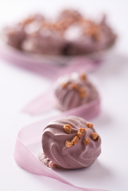 Белтъкът се разбива на бавна скорост в сух съд до пяна. Увеличава се скоростта и на 5-6 пъти се добавя захарта, докато миксера работи на високи обороти. Получава се гъста захарна смес. Добавя се ванилията, лимоновия сок и сладкарската боя и с лъжица се разбърква добре. С помощта на пош или шприц се оформят целувките. Декорират се с крокан и се изпичат в предварително загрята на 130 градуса фурна за около 30-40 минути. Фурната се изключва и се оставя леко отворена за около половин час. Чак тогава се вадят целувките и се охлаждат.
